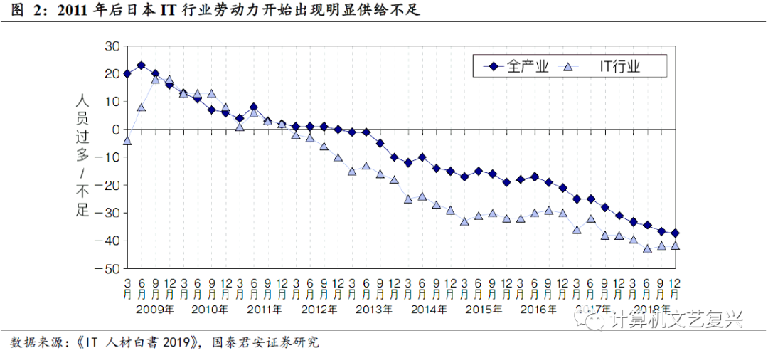 但老齡化程度不斷提升,外包人員缺口不斷放大,或將釋放千億級市場。日本人口老齡化是一個漫長的故事,但真正發揮作用是在2010年前后。到2010年,日本老齡化問題開始凸顯,面對本土程序員的接連退休,IT人員供需缺口不斷放大,可以明顯看到2011年后65歲以上老人占比開始急劇上升。日本勞動省數據顯示,到2019年IT人員缺口將達到28.8萬人,按照35萬人民幣/人/年的單價計算,其規模超千億元,并且還在不斷放大。預計到2030年,IT人員缺口規模或超過45萬人,預計將釋放超1500億人民幣的市場空間。