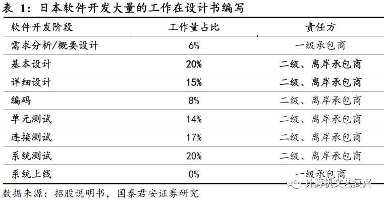 日本的軟件開發采用頂層設計思路,其中最大的工作量在于設計書編寫。設計書的編寫在日本定制軟件開發工程中是最為重要的步驟,日本人習慣在寫代碼之前,要有詳細的設計書,而根據設計書復刻代碼,是一件很容易的事。根據公司招股書數據,公司在軟件開發執行過程中,大部分工作量主要花費在設計書的編寫上。例如,公司開發的“投資顧問平臺去FLASH化對應”項目,其2018年10月的納品書明確記載了開發成果的種類、數量,包括基本設計書(1380頁)、詳細設計書(1130頁)、代碼(1800Step)、測試用例書(280頁)等。