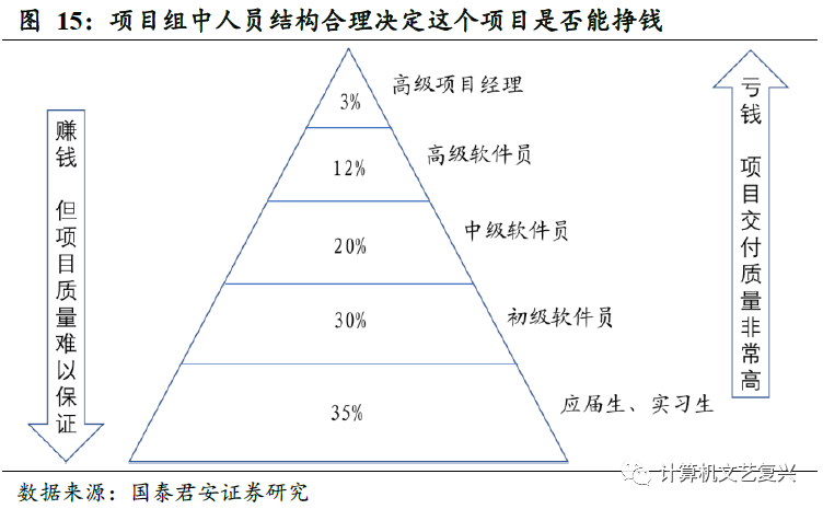 名為外包,實則解決方案輸出。我們在10月22日發布的的報告《軟件服務也可以是一門好生意》中詳細闡述了三種外包模式(人力外包、單環節外包、解決方案外包)的區別。單純人力外包交付的僅僅是人頭,客戶檢查的是所購買勞動力的考勤記錄。而解決方案外包,軟件服務公司交付的是系統而非勞動力,只不過這個系統的定價是由社會平均勞動量決定的。在這種情況下,軟件服務公司若能高效完成任務,其實不需要投入合同中規定的人力,因此有效率提升的可能。因此大多數的解決方案外包毛利率是要高于單純人力外包的,而目前來看,凌志基本所有的項目,都是解決方案外包。