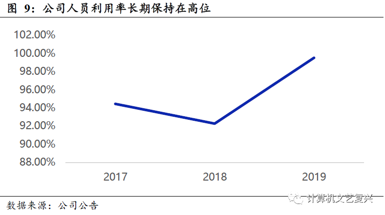 工作量可提前計劃,人員利用率高。對于軟件服務公司而言,一個非常重要的指標就是人員利用率,也就是在這個行業內的“產能利用率”。當一個新項目落地后是否需要招人,以及項目結束后釋放出的人手能否快速投入下一個項目,是衡量一家軟件服務公司管理能力的關鍵。若出現產能與需求不匹配的現象,很可能導致企業短期利潤出現大幅波動。然而,日本的軟件開發有著非常嚴密的頂層設計理論,會將一個系統的全生命周期任務規劃好后再進行實施,一般一個系統后續維護的投入是初次上線投入的4-5倍左右。因此對于對日的外包商而言,客戶的需求是可以提前預測到的,這大大降低了匹配產能和需求的難度,使得公司的人員利用率長期保持在95%以上。