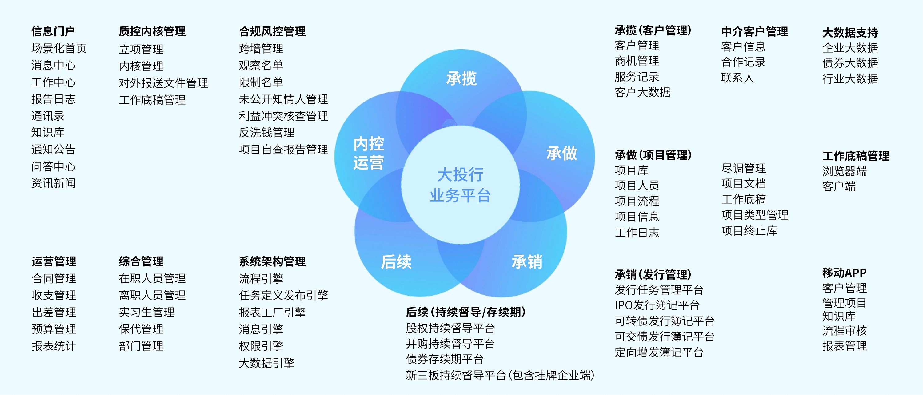 5大業務階段:從承攬、承做、申報反饋、發行上市、持續督導/受托階段,業務全流程打通,規范業務管理流程制度。
