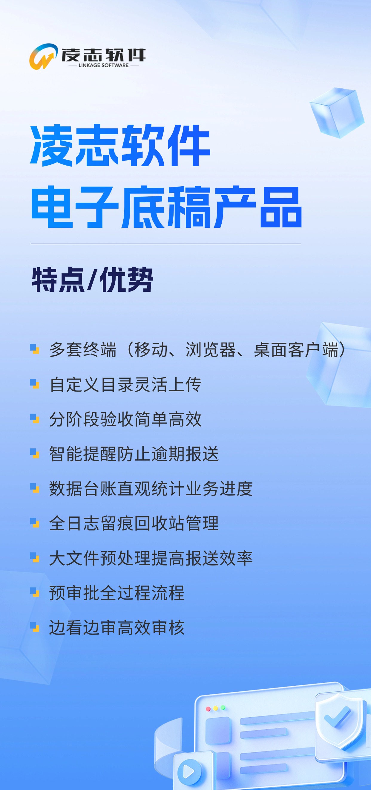 凌志軟件電子底稿產(chǎn)品專為證券、基金、資產(chǎn)管理等金融行業(yè)量身打造,是一款紙質(zhì)底稿文件電子化管理系統(tǒng),旨在實現(xiàn)對電子底稿的線上編制、審核和報送監(jiān)管。該產(chǎn)品核心功能包括統(tǒng)一門戶、智能提醒、報送校驗、報送臺賬、性能監(jiān)控等,產(chǎn)品不僅滿足證監(jiān)會、證券業(yè)協(xié)會、交易所制定的要求,并能夠?qū)崿F(xiàn)與證券業(yè)協(xié)會底稿監(jiān)管系統(tǒng)對接,為投行業(yè)務(wù)部門和質(zhì)控部門提供穩(wěn)定、可靠的技術(shù)支持,確保業(yè)務(wù)運(yùn)行的安全與合規(guī)性。