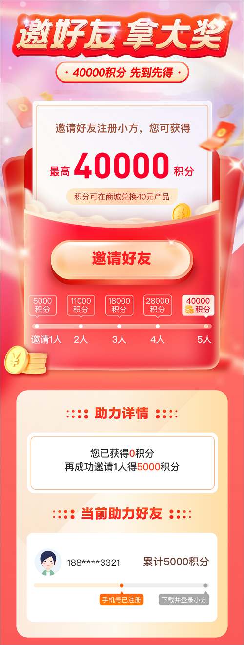 以邀請(qǐng)好友注冊(cè)的形式實(shí)現(xiàn)裂變活動(dòng),通過(guò)做任務(wù)的方式讓邀請(qǐng)人及被邀請(qǐng)人均獲得積分獎(jiǎng)勵(lì)從而達(dá)到更多用戶注冊(cè)的目標(biāo)。