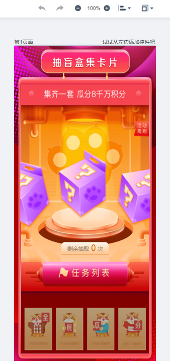 通過(guò)拖拉拽的方式放置抽盲盒組件及領(lǐng)獎(jiǎng)等組件