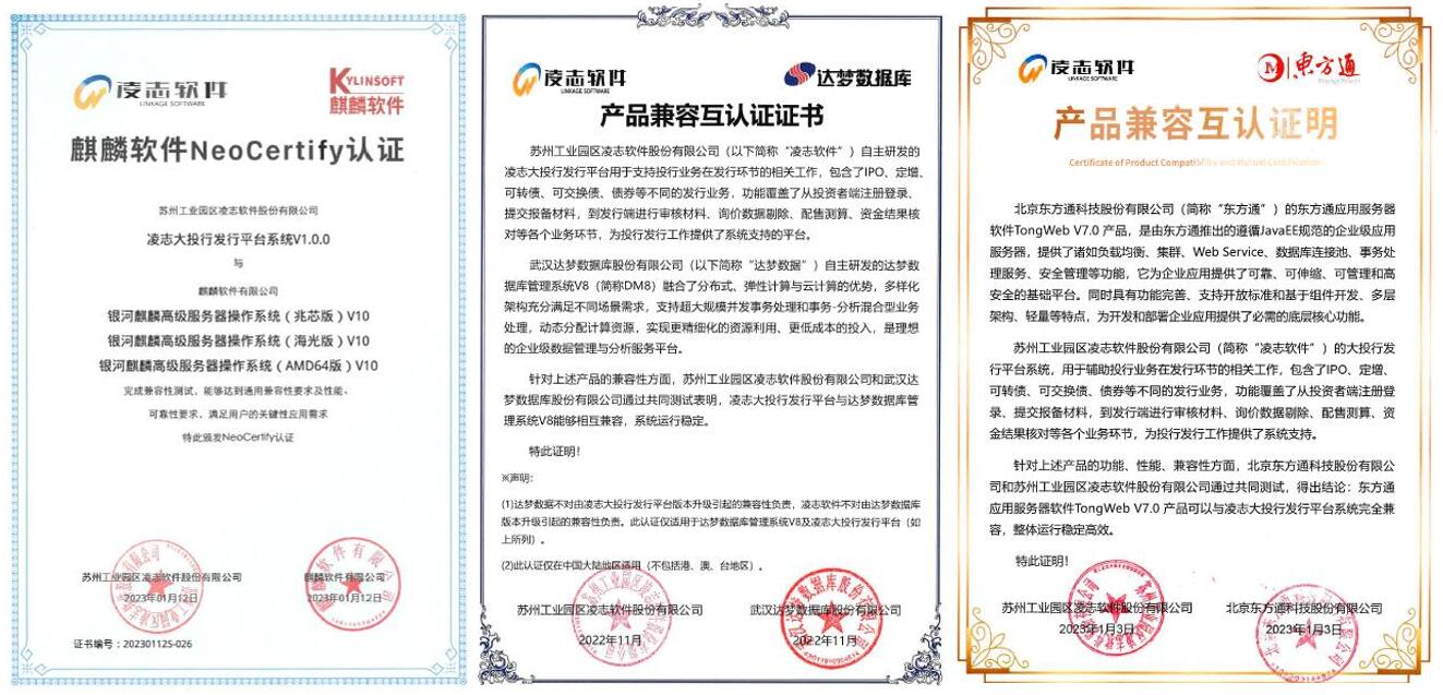 測(cè)試結(jié)果顯示,凌志軟件大投行發(fā)行平臺(tái)系統(tǒng)與銀河麒麟高級(jí)服務(wù)器操作系統(tǒng)V10(兆芯版、海光版、AMD64版)、達(dá)夢(mèng)數(shù)據(jù)庫(kù)管理系統(tǒng)V8以及東方通應(yīng)用服務(wù)器軟件TongWeb V7.0完全兼容,系統(tǒng)運(yùn)行穩(wěn)定、安全、高效。