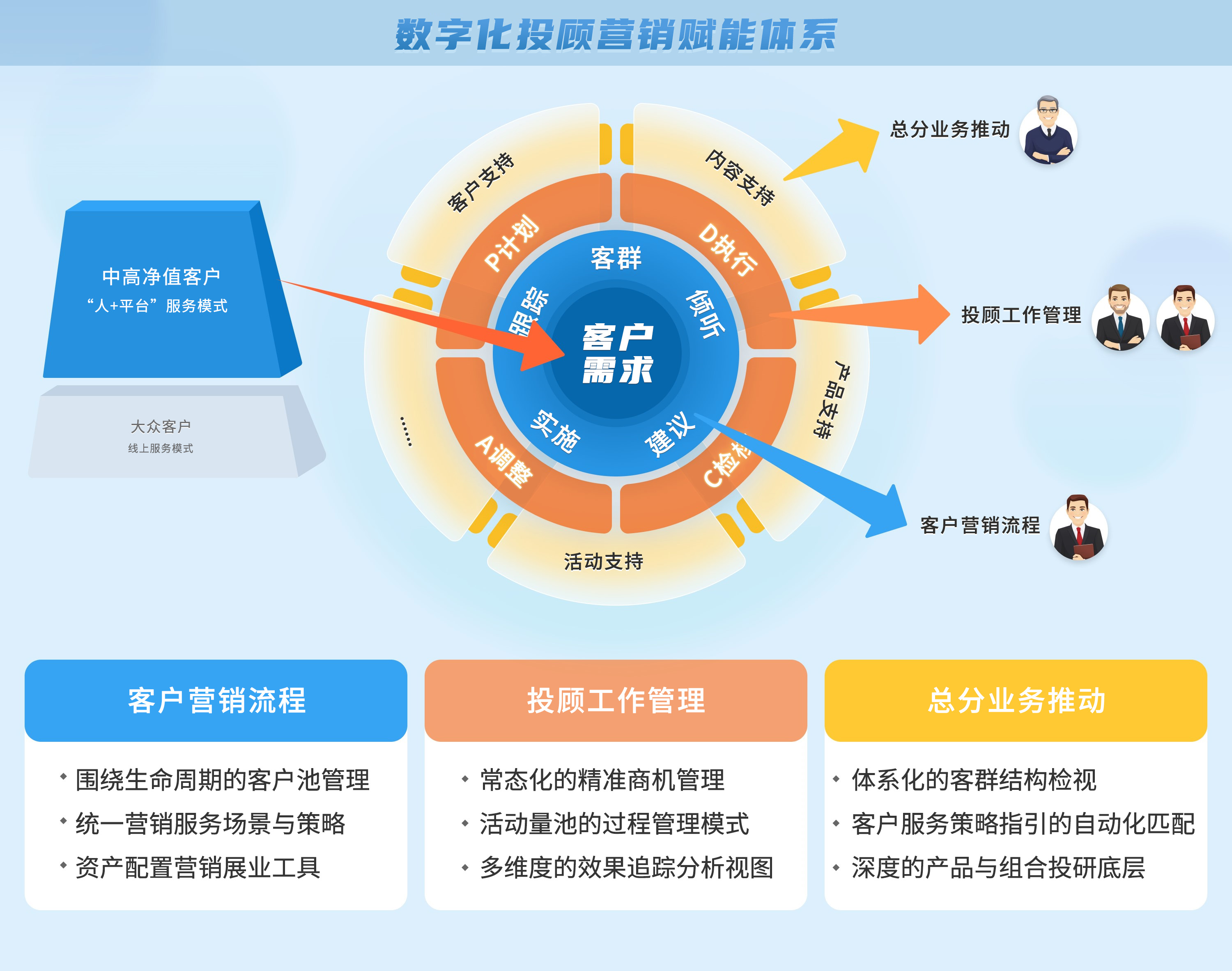 數(shù)字化投顧營銷賦能體系的實際落地,依托兩大核心能力,一是以資產(chǎn)配置服務(wù)為中心的買方投顧業(yè)務(wù)能力,二是關(guān)注客戶AUM結(jié)構(gòu)的客群經(jīng)營能力。旨在解決券商現(xiàn)有投顧展業(yè)平臺存在的問題,包括總分中臺與一線團(tuán)隊業(yè)績達(dá)成思路不一致、一線管盤客戶服務(wù)覆蓋不足、日常服務(wù)無法滿足客戶個性化需求、以及投顧工作過程管理不透明等現(xiàn)狀。
