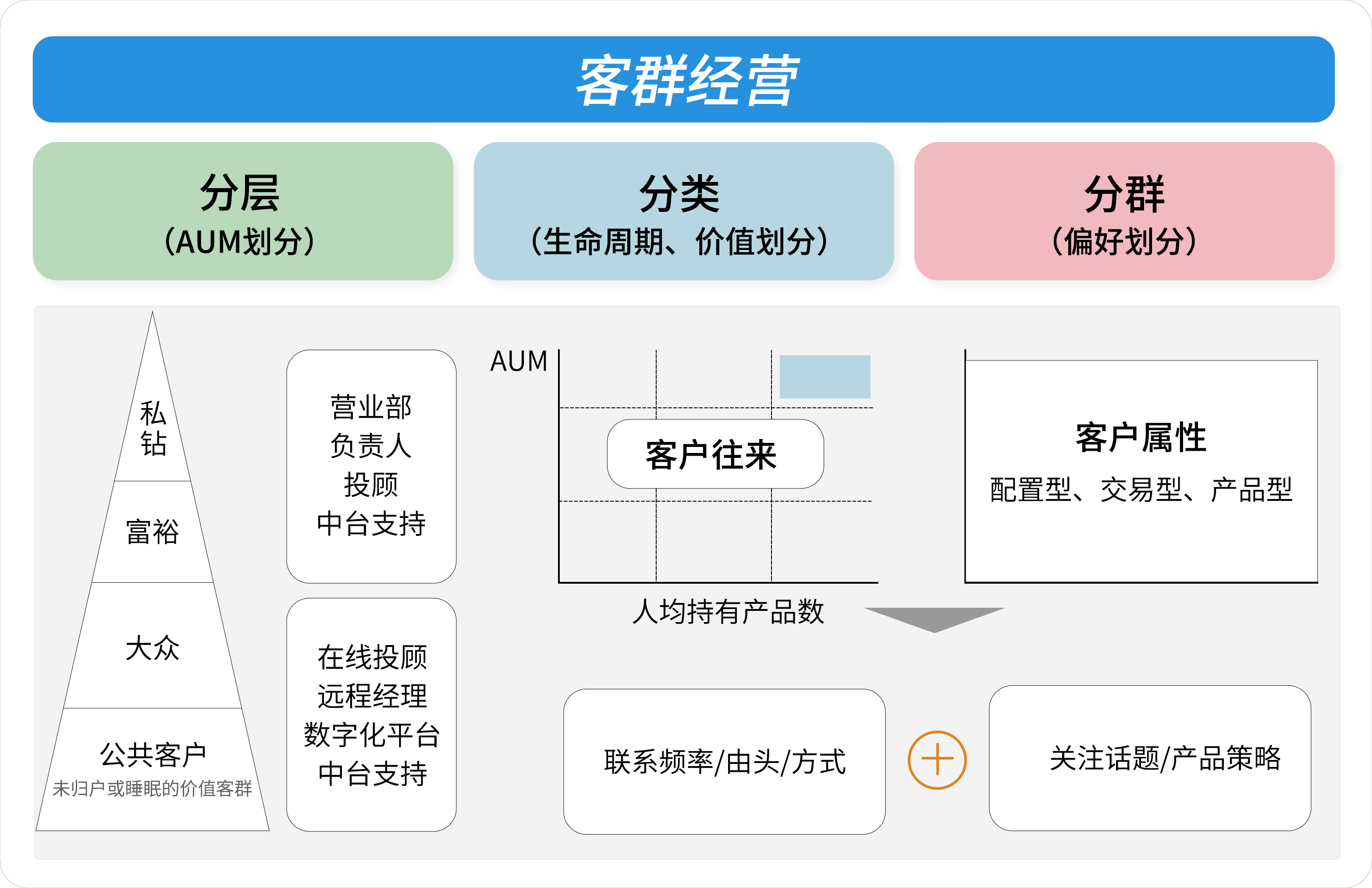 總分中臺從整體業(yè)績達(dá)成思路變革,搭建前中臺聯(lián)動、高效的營銷賦能體系,聚焦投顧服務(wù)視角,關(guān)注客戶AUM結(jié)構(gòu)和資產(chǎn)配置需求。通過規(guī)范客戶經(jīng)營流程,提煉標(biāo)準(zhǔn)化的營銷場景、策略以及展業(yè)工具賦能投顧,日常透過投顧的營銷過程追蹤管理,不局限于電訪、面談活動量,同時總分業(yè)務(wù)推動上為客群室和產(chǎn)品室提供基礎(chǔ)建設(shè)支持,包括客群結(jié)構(gòu)檢視看板、策略指引的自動化匹配工具以及深度的產(chǎn)品與組合投研底層支持。